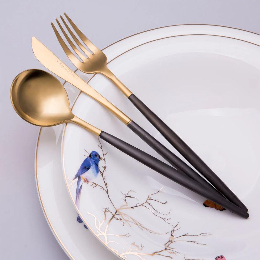 Vous allez adorer le design de Karaca Lydia, la ménagère de 60 pièces aux manches longues, fines et noires. Très tendance, la couleur doré de l’ensemble s'harmonise parfaitement avec le noir. Vous pouvez utiliser cet ensemble lors d’un repas, un service à dessert ou bien lors d’un service à thé. Vos convives seront éblouis par la présentation de votre table décorée par la ménagère Karaca Lydia et ajancée avec un service de table aussi élégant que celle-ci.