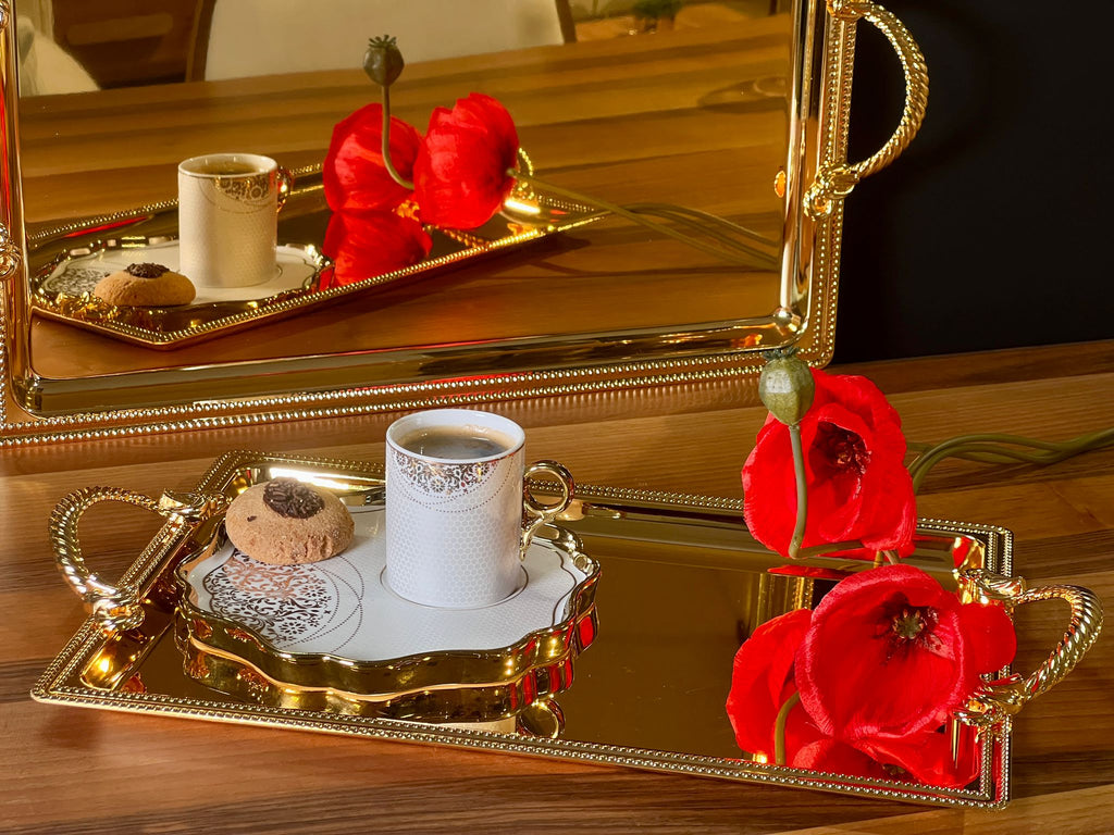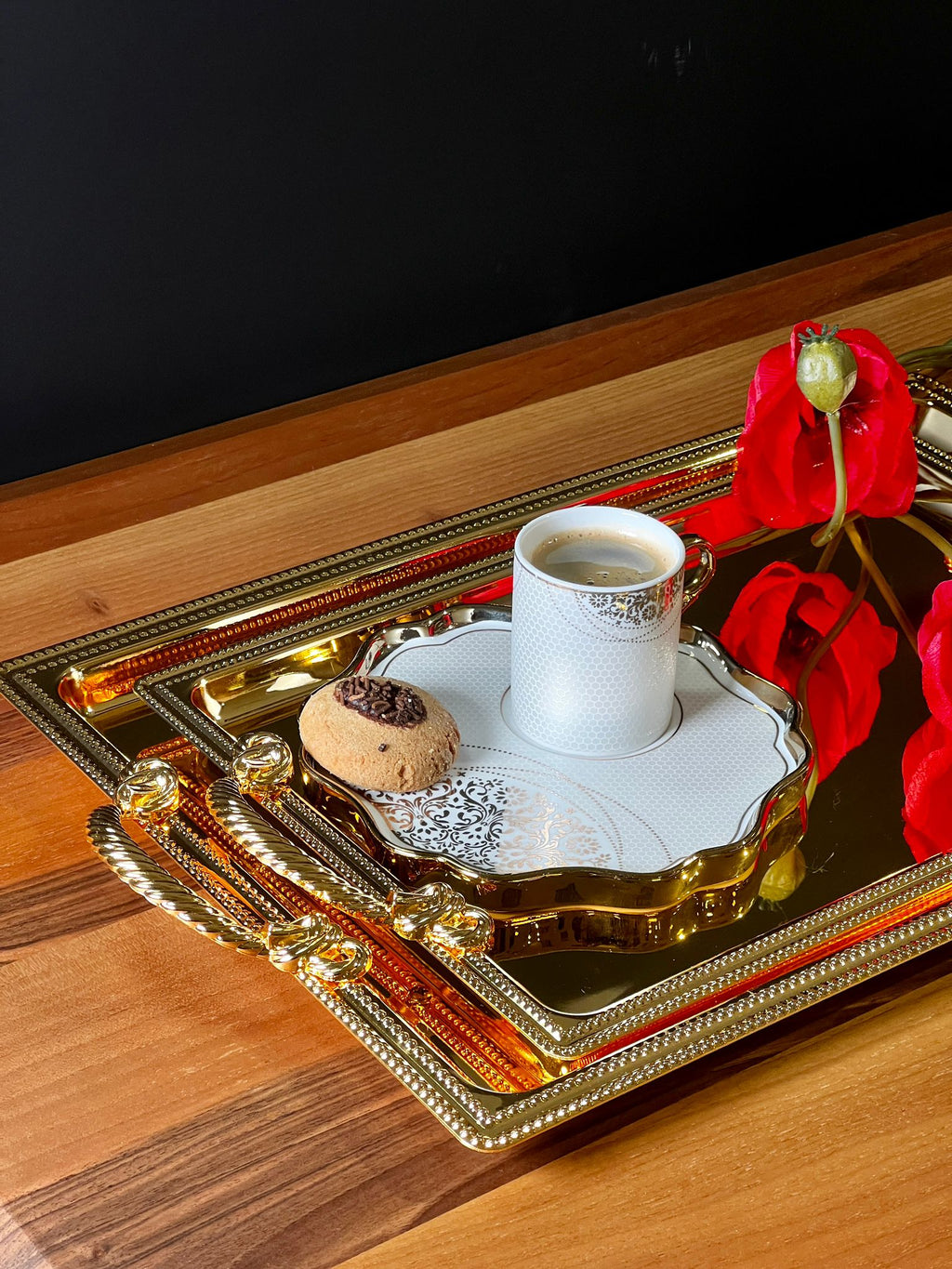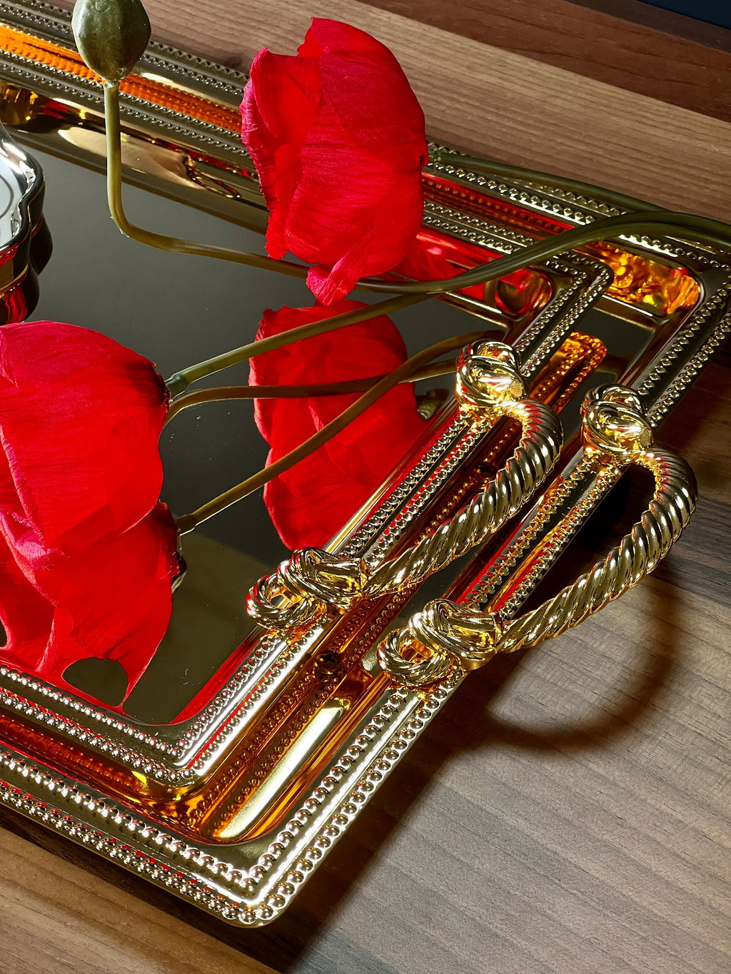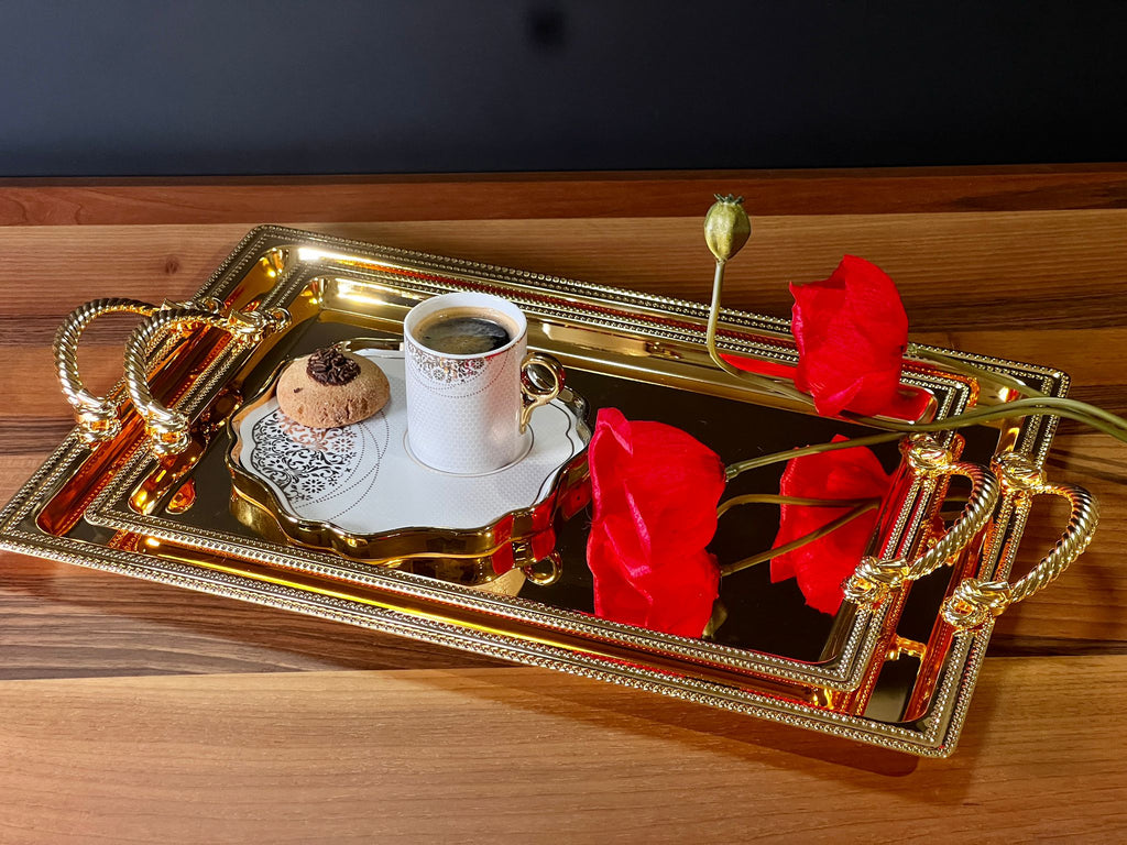 Lot de 2 plateaux de service en acier inoxydable de couleur doré avec des poignées. C'est un produit idéal pour servir des pâtisseries avec accompagnement thé ou café.