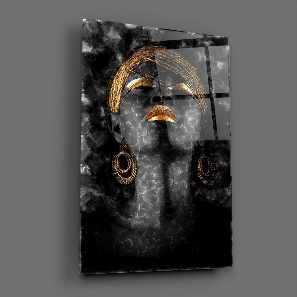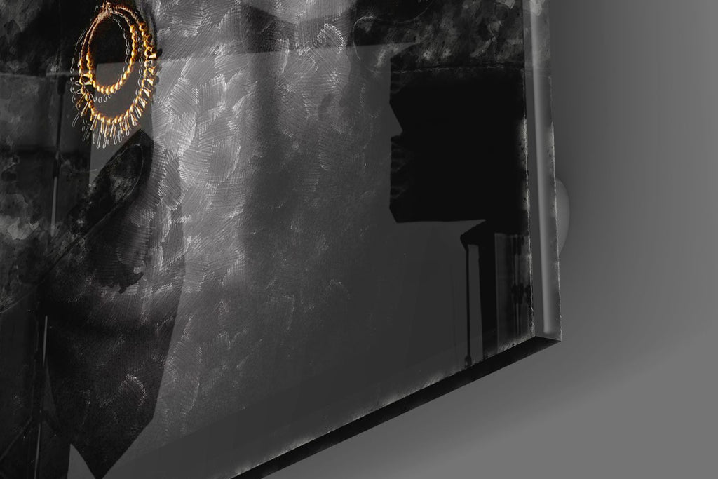 Ce tableau sur verre est une déclaration de design intérieur audacieuse qui combine l'attrait d'une impression photographique moderne avec la dureté et la brillance du verre. Elle représente une dame sensuelle parée de fils ethniques et de bijoux, elle est prise à mi-chemin alors qu'elle est en pleine sérénité dans des pensées profondes, sa peau brille. Les nuances monochromes de cet art mural photographique donnent encore vie à la chute des textures et des formes.