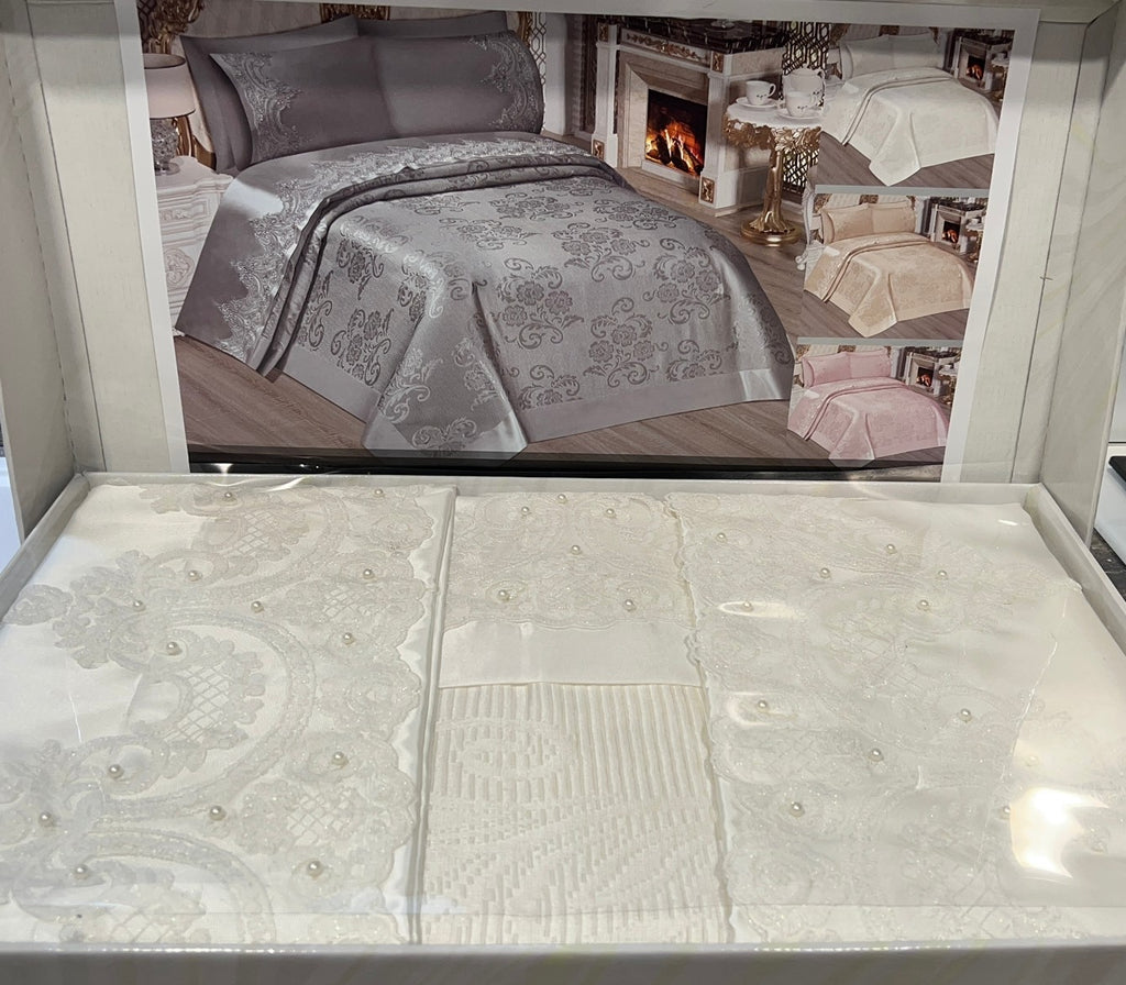 TREND HOME ALYA Ensemble Couvre-lit satiné avec dentelle 2 personnes 6 pièces CREME