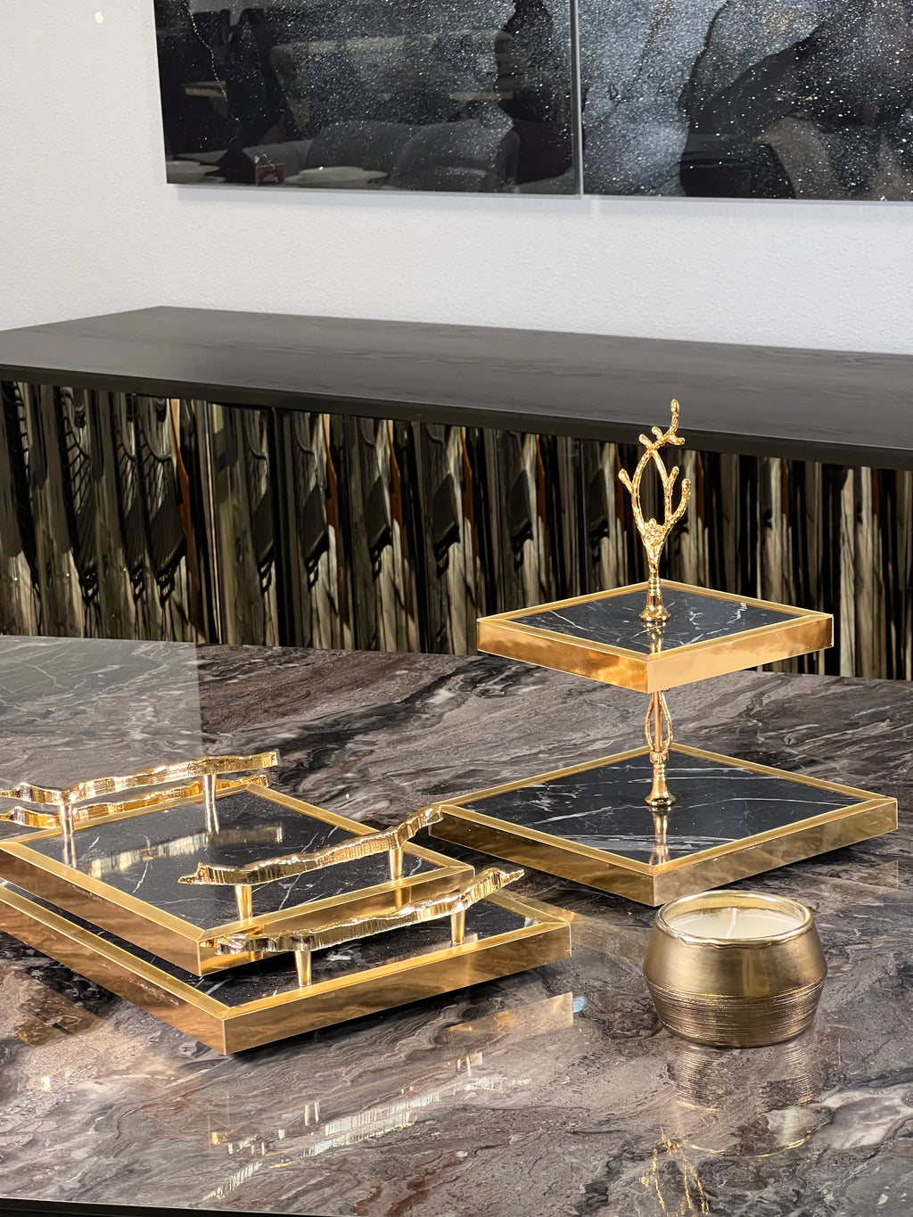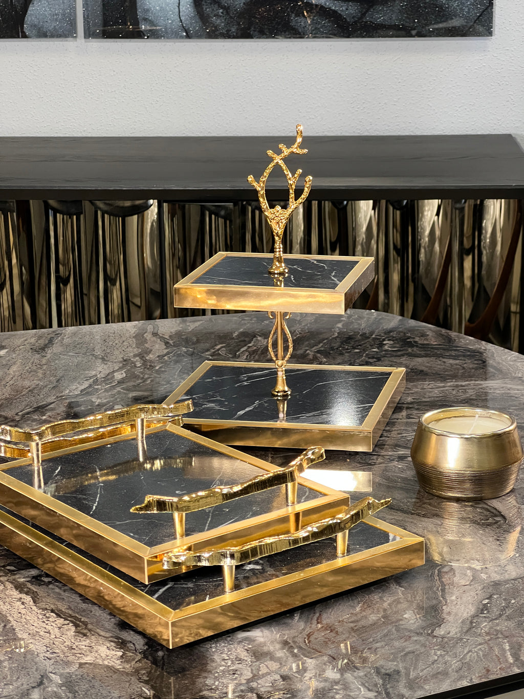 Alors j’ai été séduite par le model doré et noir marbré super joli. En revanche ce sont plutôt des plateaux de décoration. Il n’y a pas de bord pour stabiliser les verres à thé et ça glisse. Je les ai finalement mis sur mon plan de travail en décoration avec ma théière dessus et parfois un pot de fleurs 🌺
