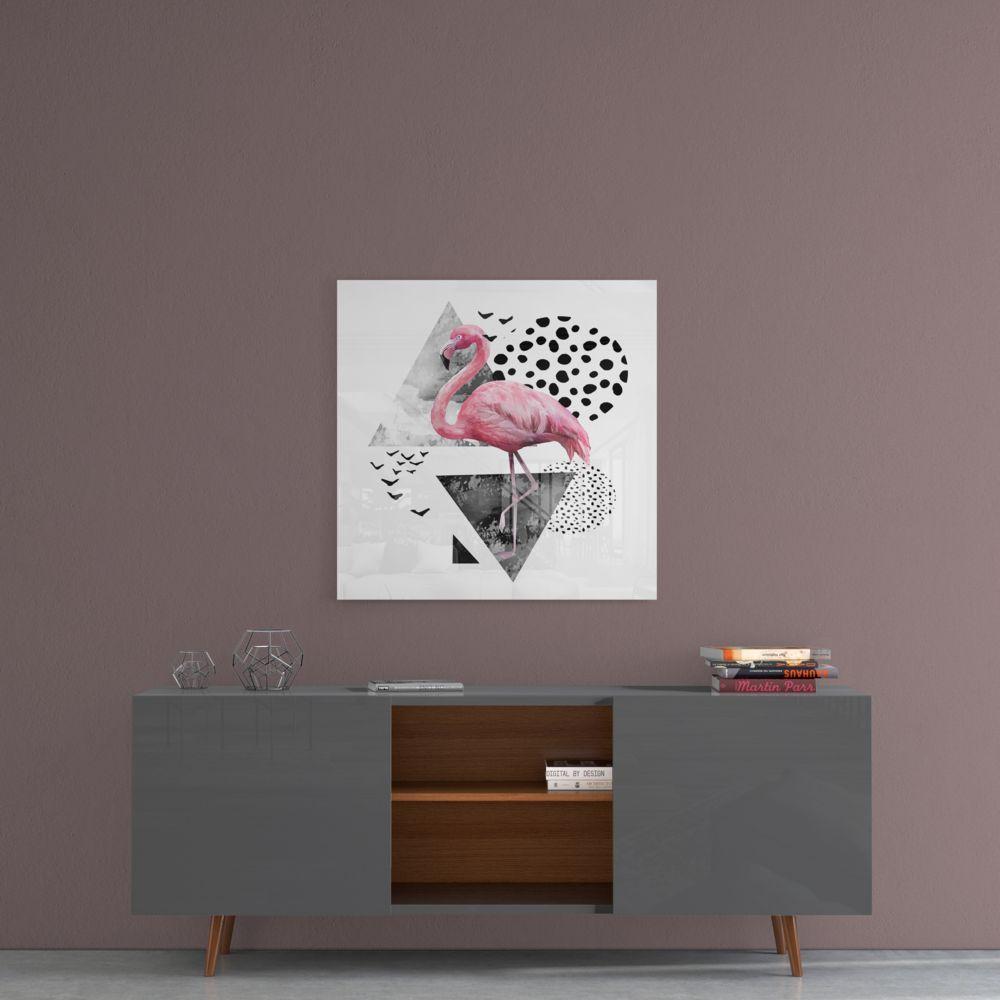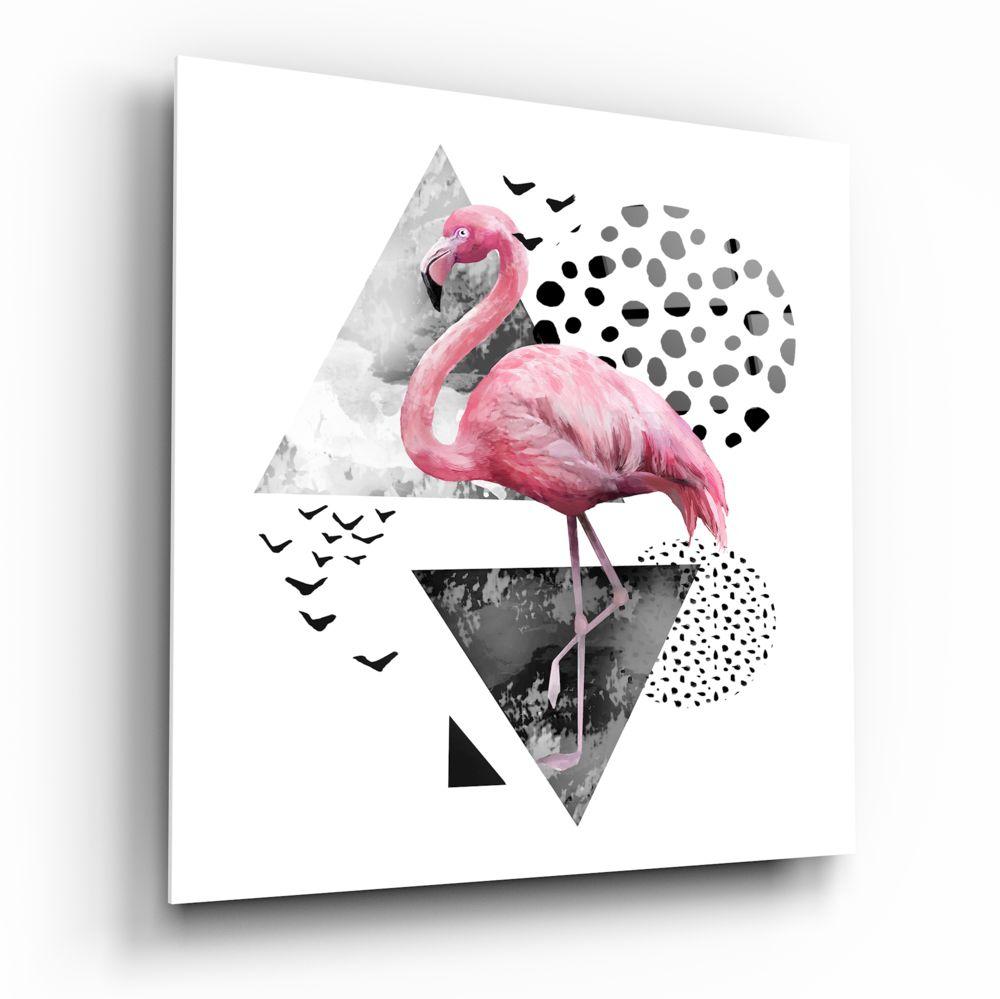 Suda yürüyen bir flamingo cam resmi, beyaz, siyah ve pembenin tamamlayıcı tonlarıyla duvarınıza rengarenk tropikal bir dokunuş katacak. Uzun ve ince bacaklara sahip olan Flamingo duvar boyunca uzanır. Bu flamingo duvar resmi, eğlenceli şekli ve parlak renkleri ile her odayı aydınlatacak.