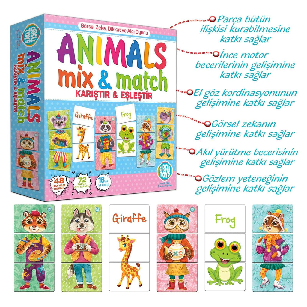 Animal Mix & Match (Karıştır Eşleştir) çok eğlenceli bir oyun. Kartların ön yüzünde her biri 3 parçadan oluşan 24 hayvan figürü bulunmaktadır. Kafa, gövde ve ayakların hangi hayvana ait olduğunu bulmak birincil oyundur.