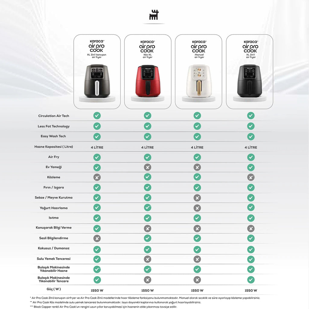 Hem lezzetli hem sağlıklı beslenmek isteyenlere, Air Pro Cook. Sağlıklı kızartmalar, ev yoğurdu, sebze-meyve kurutma, fırın ve ızgara lezzetlerinin yanı sıra sulu yemek de yapabilen Karaca Air Pro Cook, tüm lezzetleri Less Fat Technology ile sadece bir kaşık yağ kullanarak hazırlar.