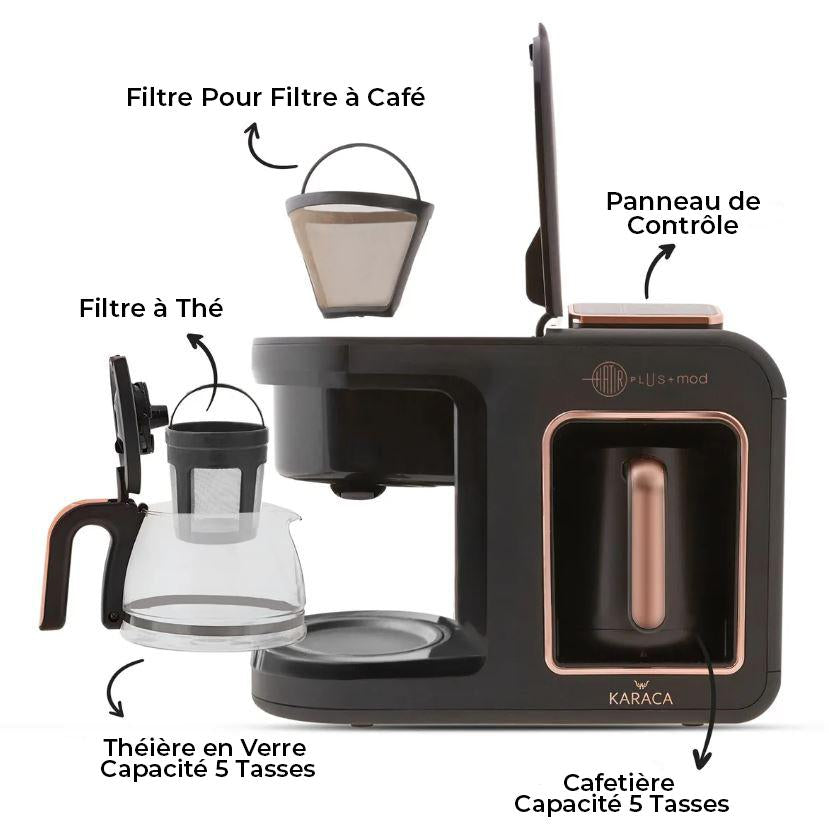 Karaca Hatır Plus Mod’un cam demliğinde 5 fincan filtre kahve veya çay demleyebilir, eş zamanlı olarak cezvesinde ise 5 fincan Közde Türk Kahvesi pişirebilir veya sütlü içecekler hazırlayabilirsiniz.