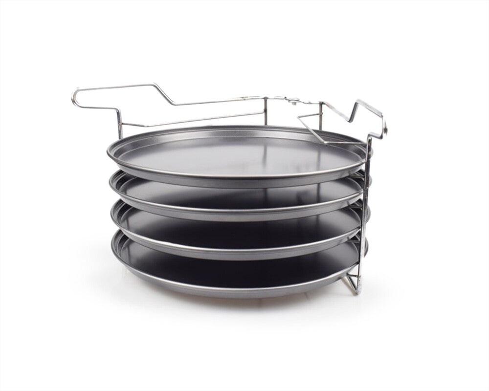 Pizza pişirme setimizle, büyük kulplu pratik rafımızda üst üste dizilmiş ayrı fırın tepsilerinde aynı anda pişirilen dört yuvarlak pizzayı aynı anda yapabilirsiniz.