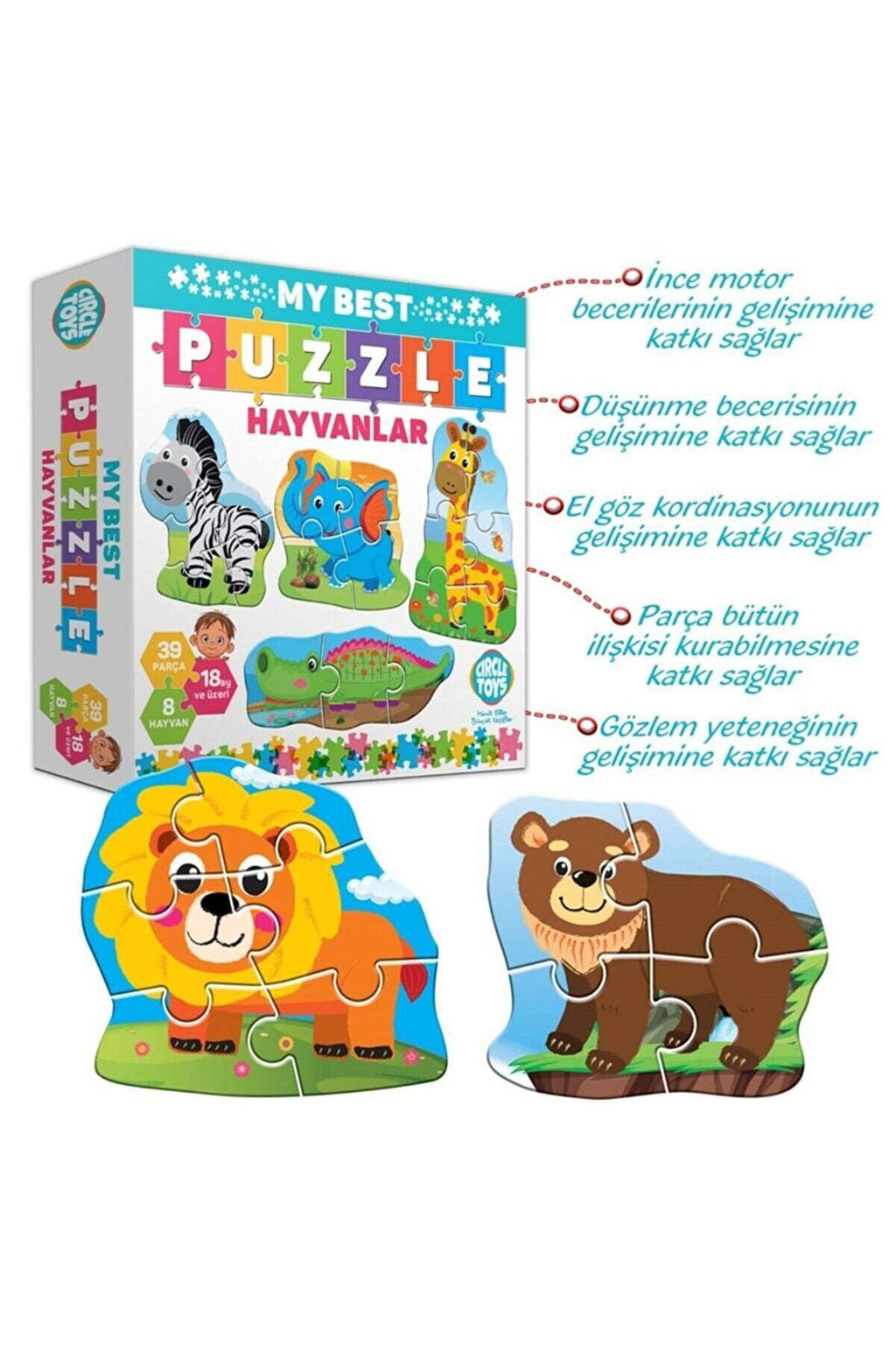 8 Adet hayvan puzzle dan oluşmaktadır3,4,5 ve 6 parça olarak toplam 39 parçadır.