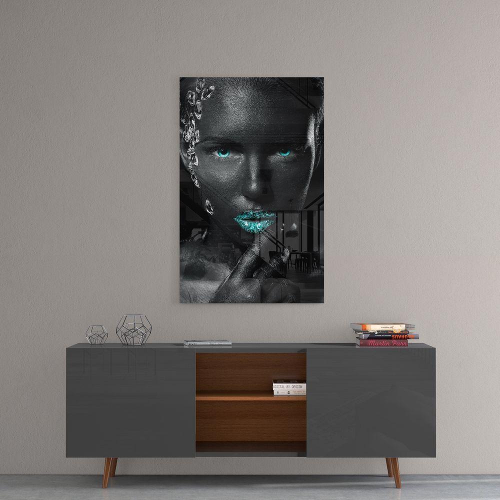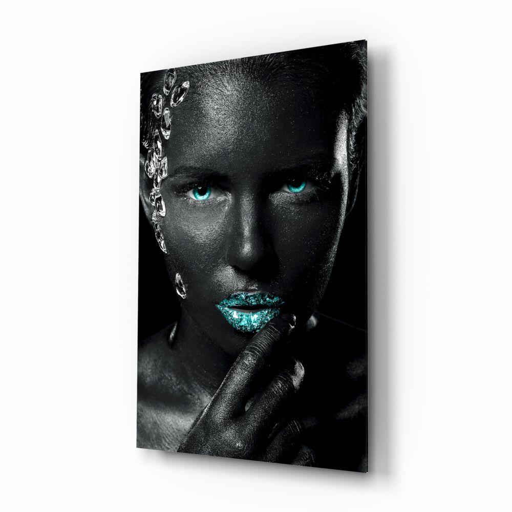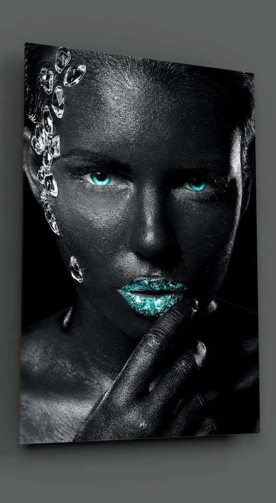 Afrikalı kadının makyaj ve yüz izlenimi, dudaklarda ve gözlerde maviden oluşuyor. Uzaklara bakıyor, zarif eli çene kemiğinde duruyor, derin ve dramatik şeffaf yapay elmaslar saçlarında duruyor ve kulağından yanağına geçiyor. Yüzünde ışık ve gölge oynuyor, siyah fon ise teninin koyu tonlarına hayat veriyor.
